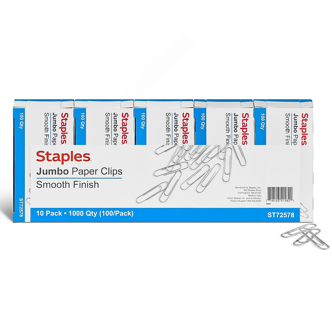 Secure paperwork with these jumbo paper clips. The fasteners hold pages firmly in place to prevent them from slipping, and the smooth finish doesn’t rip or tear papers. Ideal for a variety of uses, these paper clips are perfect for attaching brochures, business cards and other documents. These Staples paper clips feature a classic silver finish that looks discreet and professional when in use.