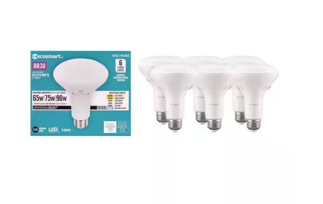 Introducing Ecosmart Universal Select. These BR30 LED bulbs are designed to replace any BR30 in your home. Take the guess work out of finding the perfect replacement LED bulb. Each of these LED bulbs are equipped with 2-switches. You can select your preferred color temperature by adjusting the switch on the neck of the bulb. Not sure what color you prefer? That’s why this bulb is equipped with 6-color temperatures so you can decide what best suits your needs. This LED BR30 bulb is also equipped with a switch to select the max wattage equivalent level and lumen output. This is so you can find the perfect brightness to meet your needs. The Universal Select LED BR30 bulb is perfect for replacing any of your current BR30 bulbs and is suitable to be installed at multiple heights. It contains all the specs inside a single bulb so you don’t need to worry about finding the perfect replacement. You can adjust the settings at home to create the perfect bulb to suit your needs. Rated to last for 15,000 hours, dimmable and suitable for enclosed fixtures. Backed by Ecosmart’s 5-year warranty.