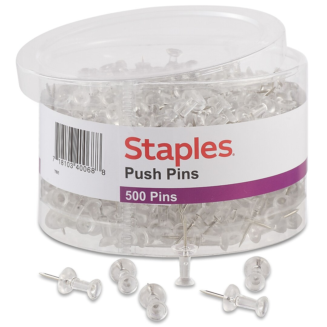 Post notices, pictures and instructions with these clear push pins. Each pin in this 500-piece tub features a sharp steel point to hold items securely. These pins are ideal for use with corkboards but can also be used on maps, wall charts and a variety of surfaces. Ready to use, these Staples push pins come packaged in a reusable tub for simple storage.