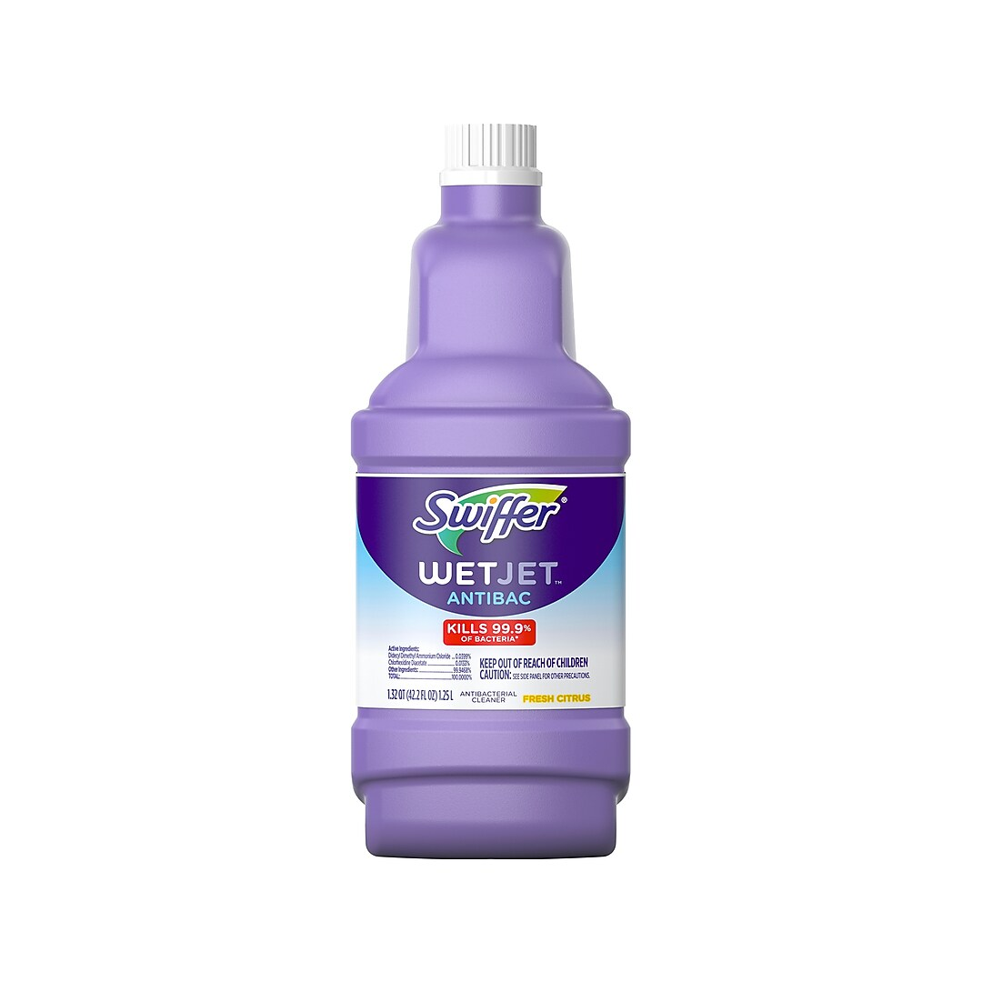 The Swiffer WetJet antibacterial solution kills 99.9% of bacteria. This fast-drying, specially made solution dissolves dirt and tough, sticky messes and comes with a Fresh Citrus scent. For use on hard nonporous floors. Use the Swiffer WetJet mop to spray the floor until thoroughly wet. Let stand for 5-10 minutes before mopping, then remove excess liquid. For visibly soiled floors, clean before following sanitizing instructions. Do not use on unfinished, oiled, or waxed wood floors.